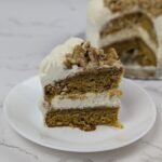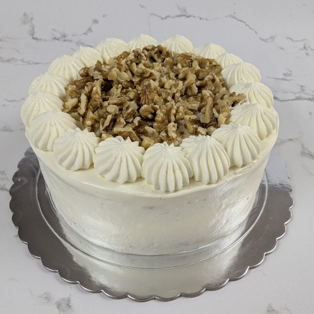 Esta carrot cake lo tiene todo: un bizcocho súper jugoso con zanahoria natural y una mezcla de especias que enamoran (canela, clavo y jengibre). Está rellena y cubierta con un frosting de queso suave y cremoso. Y para darle el toque final, la coronamos con nueces troceadas que le aportan ese crujiente perfecto.