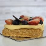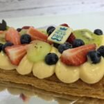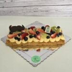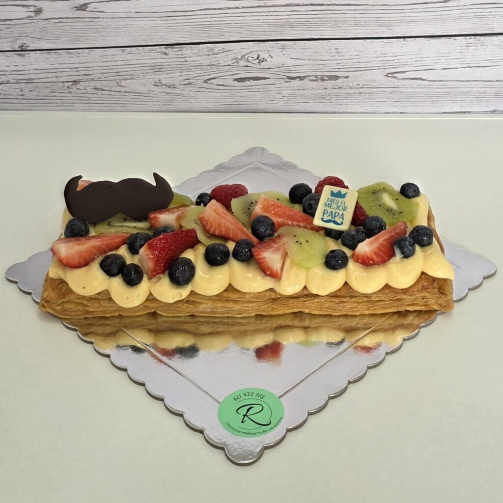 Elaborada con crujiente hojaldre artesanal, relleno a elegir entre crema pastelera o nata montada, y decorada con fruta de temporada como fresas, arándanos y kiwi.